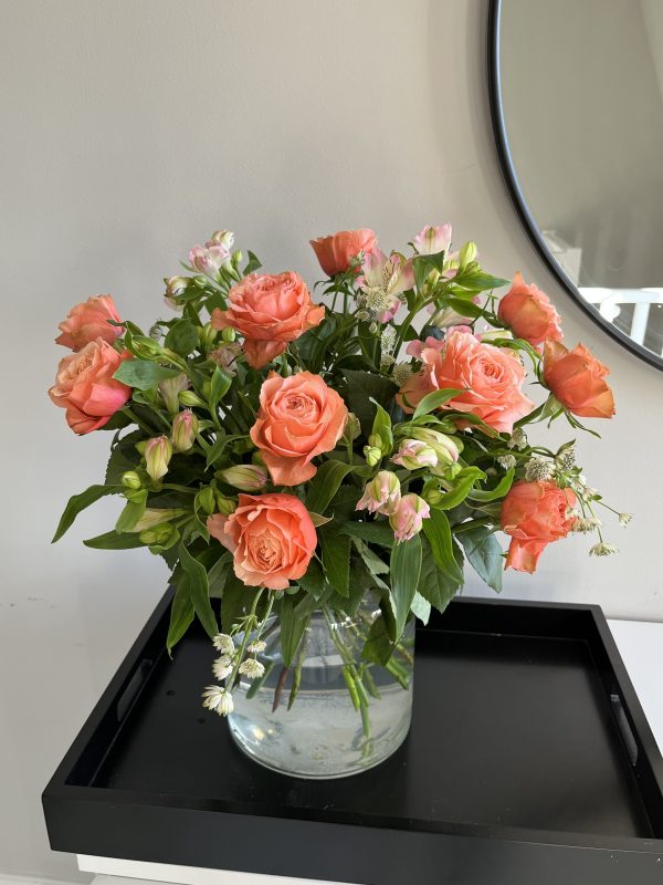 En klassiskt bunden rikt blomstrande bukett i en rund lugn form